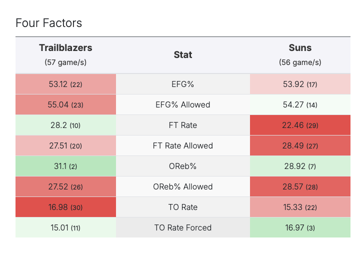Statistical Edges: Where Portland truly shines is on the glass and second chance opportunities. The Blazers are averaging 16.98 second chance points per game (2nd) while Phoenix gives up 15.16 (26th). Portland’s OReb% of 31.1 ranks 2nd, and their ability to generate extra possessions off offensive boards is a sustained, matchable advantage against a Phoenix team that is already going to be gassed after double overtime.